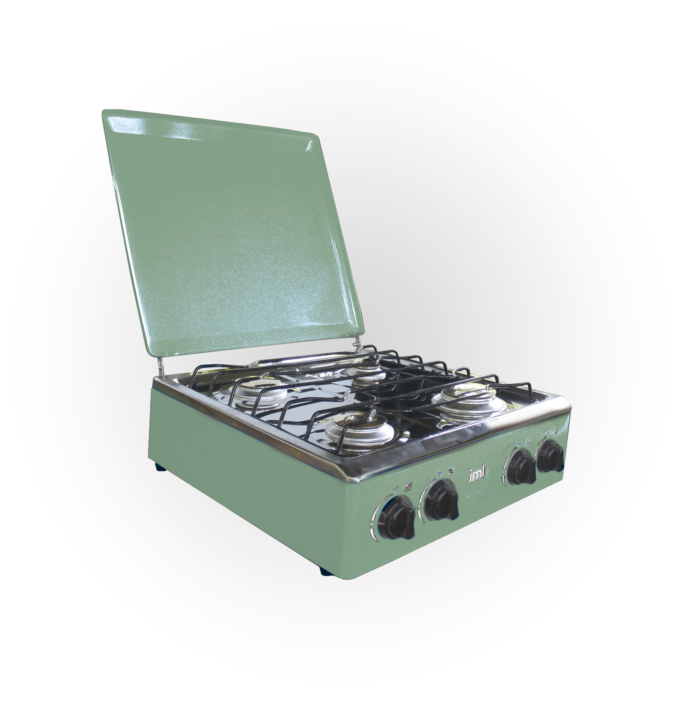Cocina de mesa con respaldo de cuatro quemadores.