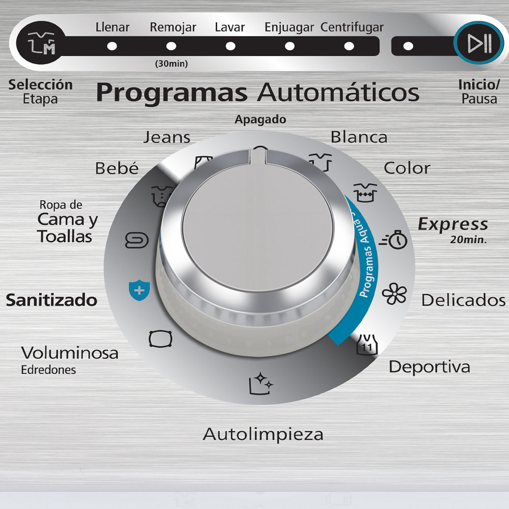 Tecnología Energy Saver Green que te brinda un ahorro de energía hasta 10%* equivalente a 56 focos LED por 60 minutos. Lavadora con nuevo diseño en perillas para seleccionar de una manera sencilla los niveles y opciones de lavado, cuenta con gran capacidad lo que te brinda ahorrar tiempo lavando más en menos cargas, además dentro de sus ciclos de lavado se encuentra Lavado Express que permite tener ropa limpia en tan solo 20 minutos.