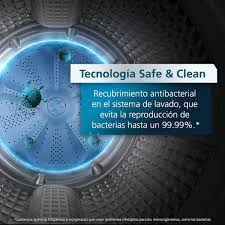 Tecnología Safe & Clean, recubrimiento antibacterial en propela, que evita la reproducción de baterias hasta un 99.99%. Maxima limpieza y cuidado de la ropa ahorrando energía, gracias al motor silencioso Direct Motion Motor. Sistema de lavado Power Wash, elimina los residuos de jabón con un lavado profundo y eficiente. Ciclo 4 Next day, eficiencia en el centrifugado.